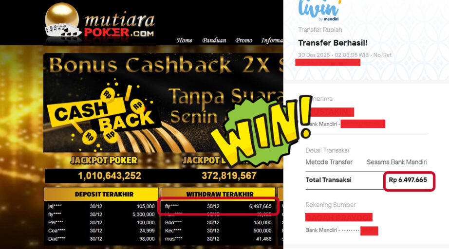 Bukti Withdraw ( 6,497,665,- ) Member Setia MutiaraPoker