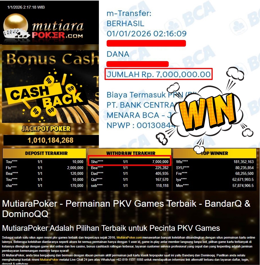 Bukti Withdraw ( 7.000.000,- ) Member Setia MutiaraPoker