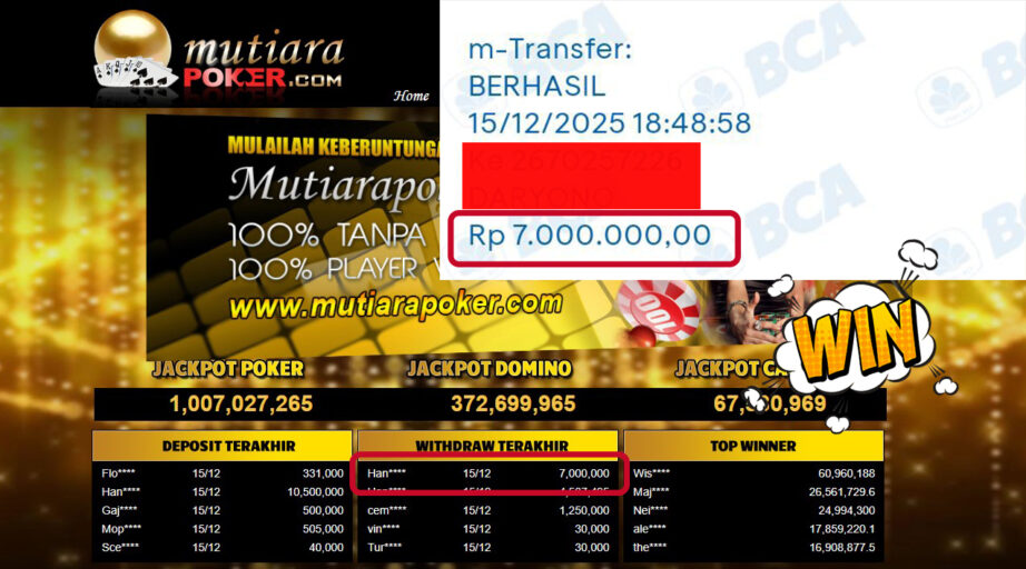 Bukti Withdraw ( 7,000,000,- ) Member Setia MutiaraPoker
