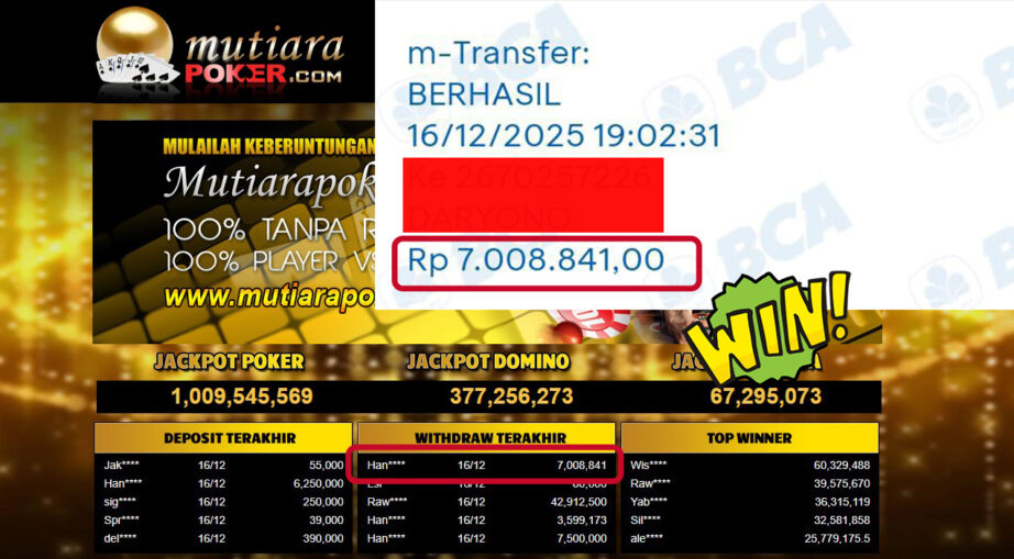 Bukti Withdraw ( 7,008,841,- ) Member Setia MutiaraPoker