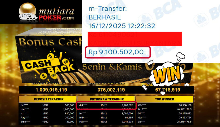 Bukti Withdraw ( 9,100,502,- ) Member Setia MutiaraPoker