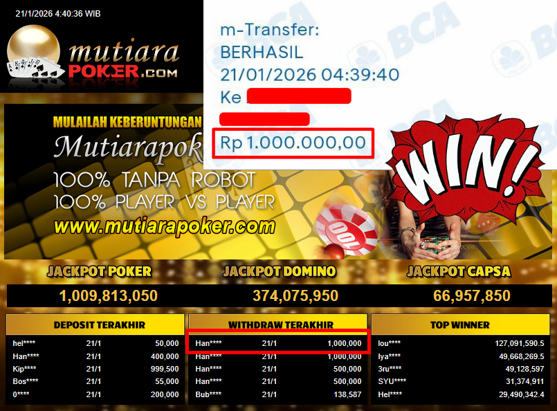 Bukti Withdraw ( 1.000.000,- ) Member Setia MutiaraPoker