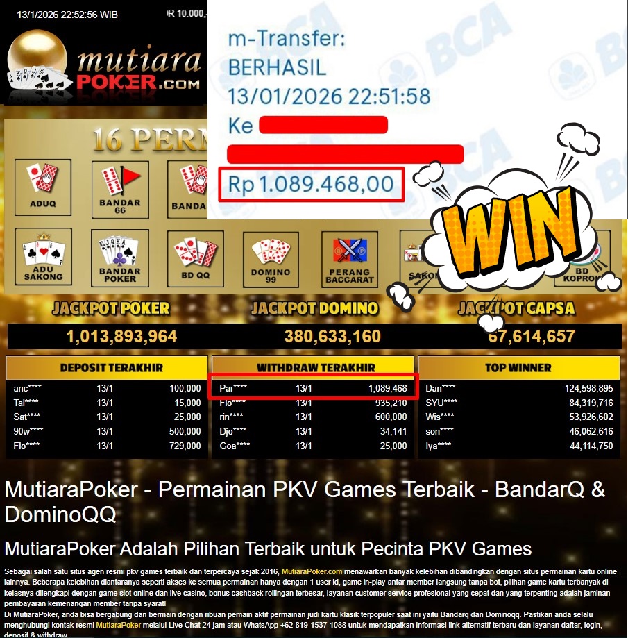 Bukti Withdraw ( 1.089.468,- ) Member Setia MutiaraPoker