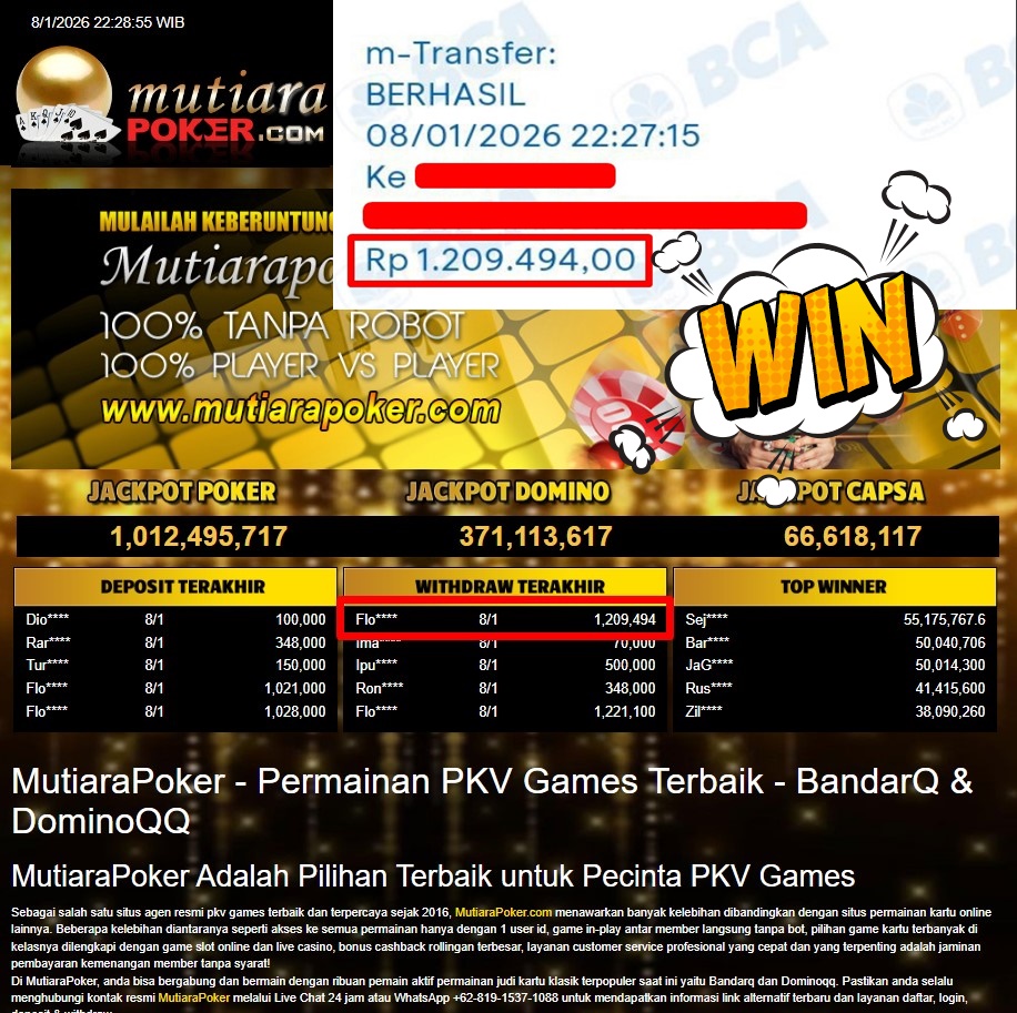 Bukti Withdraw ( 1.209.494,- ) Member Setia MutiaraPoker