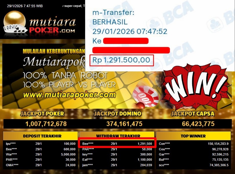 Bukti Withdraw ( 1.291.500,- ) Member Setia MutiaraPoker