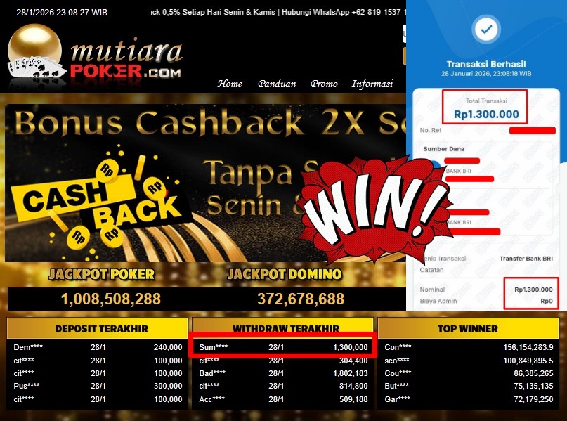 Bukti Withdraw ( 1.300.000,- ) Member Setia MutiaraPoker