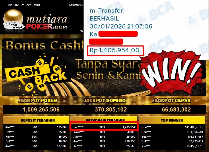 Bukti Withdraw ( 1.405.954,- ) Member Setia MutiaraPoker