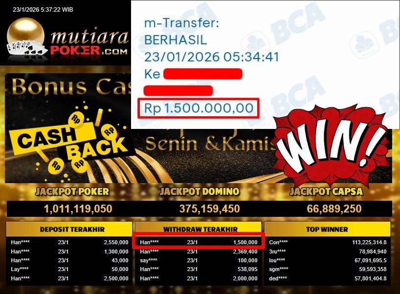 Bukti Withdraw ( 1.500.000,- ) Member Setia MutiaraPoker