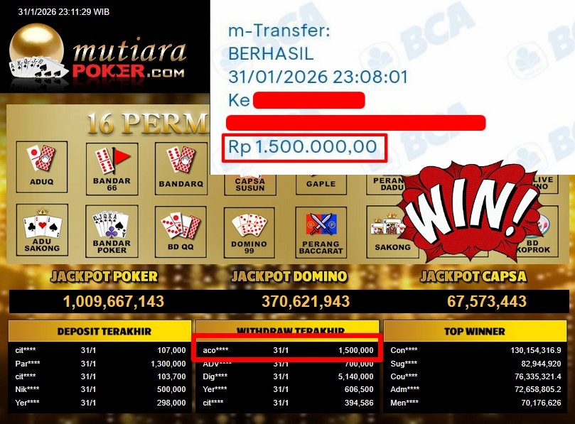 Bukti Withdraw ( 1.500.000,- ) Member Setia MutiaraPoker