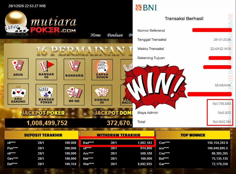 Bukti Withdraw ( 1.802.183,- ) Member Setia MutiaraPoker