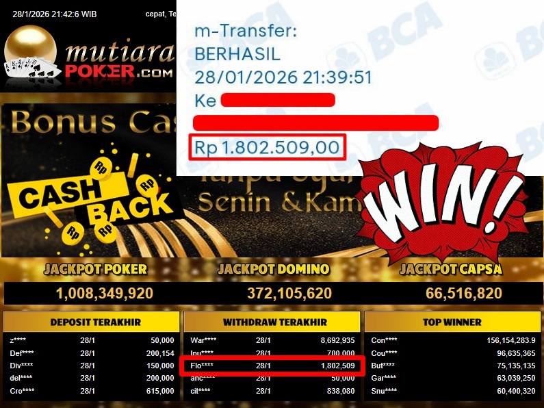 Bukti Withdraw ( 1.802.509,- ) Member Setia MutiaraPoker