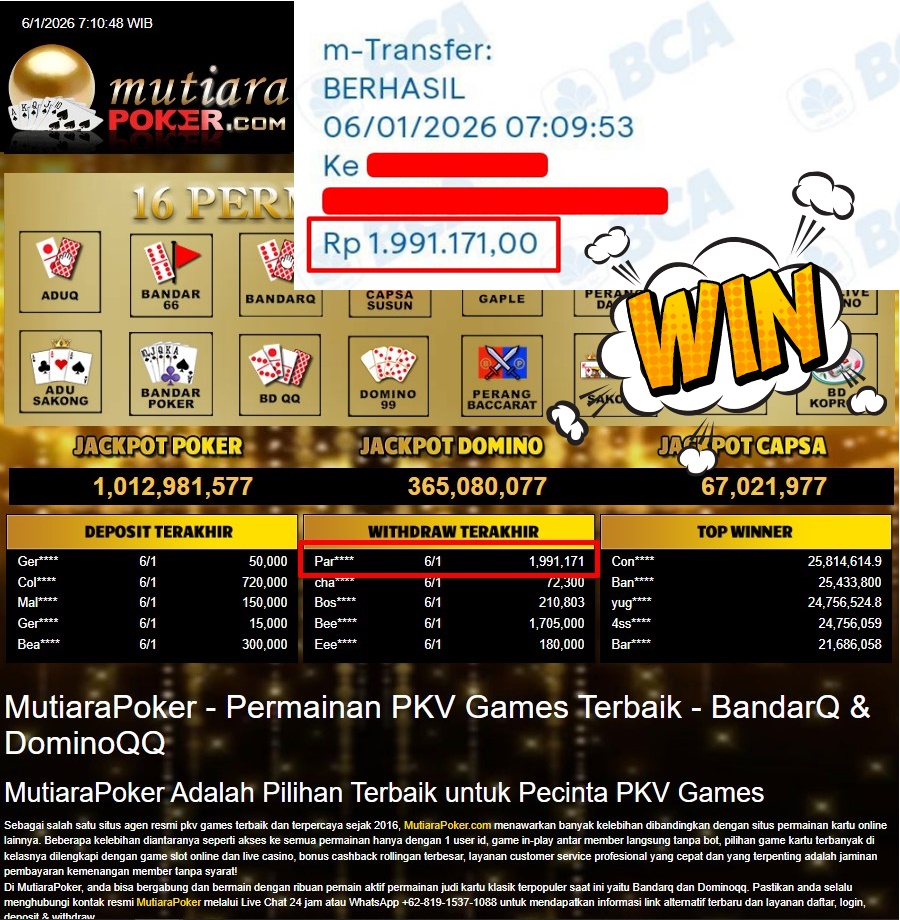Bukti Withdraw ( 1.991.171,- ) Member Setia MutiaraPoker