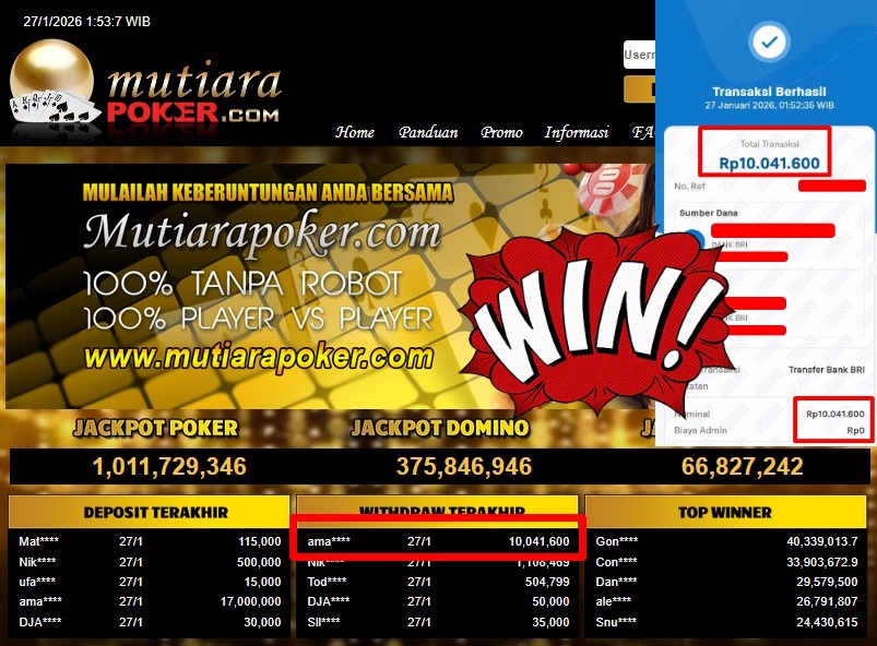 Bukti Withdraw ( 10.041.600,- ) Member Setia MutiaraPoker