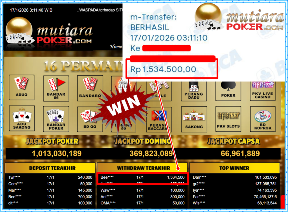 Bukti Withdraw ( 1,534,500,- ) Member Setia MutiaraPoker