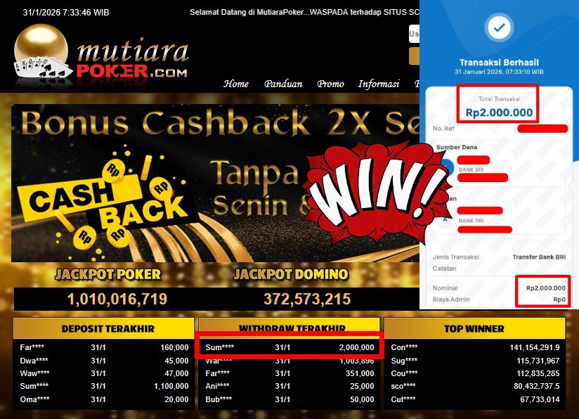 Bukti Withdraw ( 2.000.000,- ) Member Setia MutiaraPoker