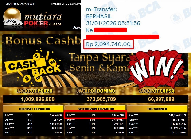 Bukti Withdraw ( 2.094.740,- ) Member Setia MutiaraPoker