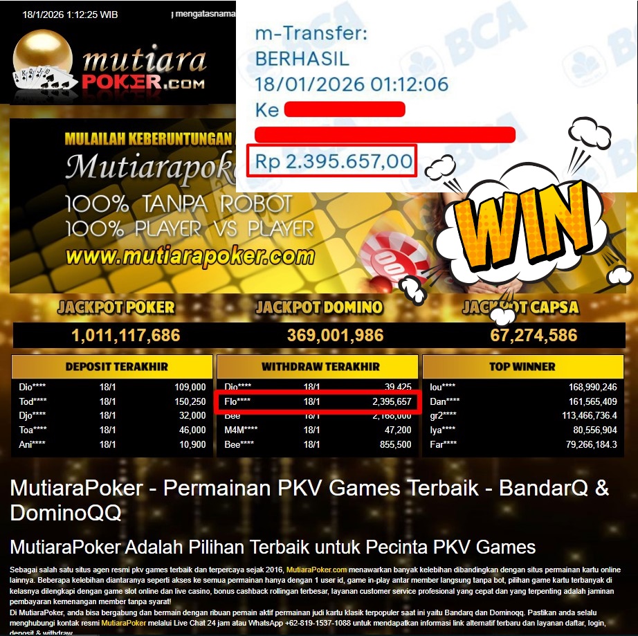 Bukti Withdraw ( 2.395.657,- ) Member Setia MutiaraPoker