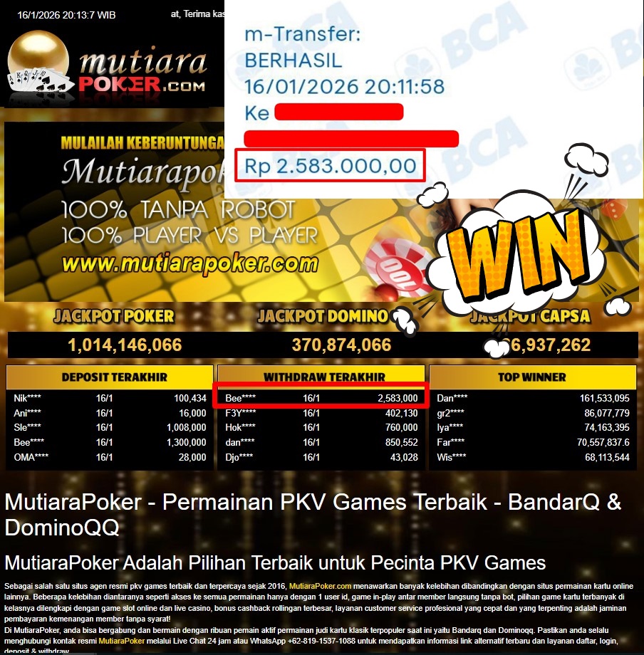 Bukti Withdraw ( 2.583.000,- ) Member Setia MutiaraPoker