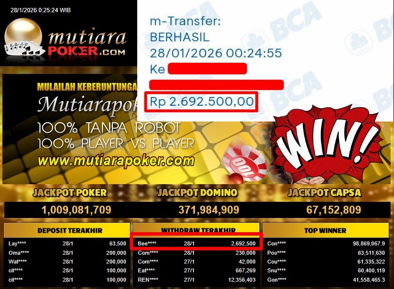Bukti Withdraw ( 2.692.500,- ) Member Setia MutiaraPoker