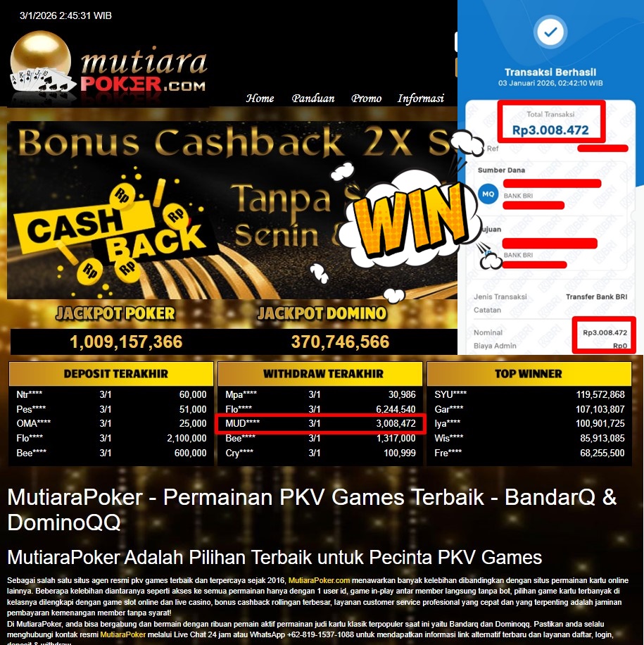 Bukti Withdraw ( 3.008.472,- ) Member Setia MutiaraPoker