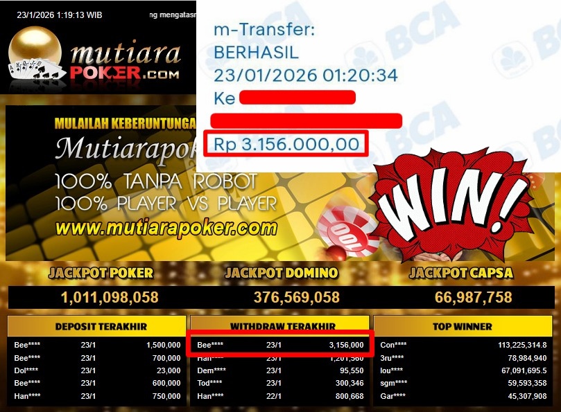 Bukti Withdraw ( 3.156.000,- ) Member Setia MutiaraPoker