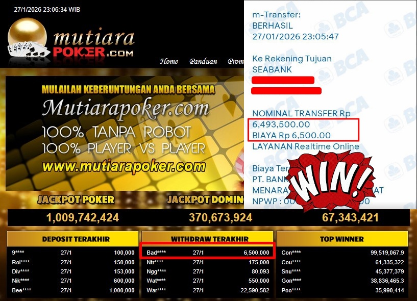 Bukti Withdraw ( 6.500.000,- ) Member Setia MutiaraPoker