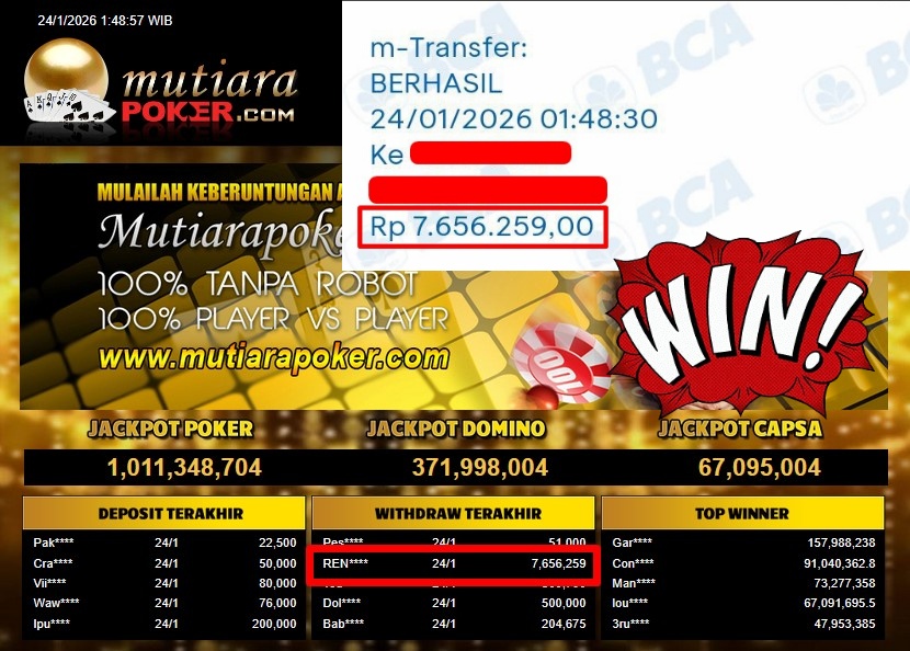 Bukti Withdraw ( 7.656.259,- ) Member Setia MutiaraPoker