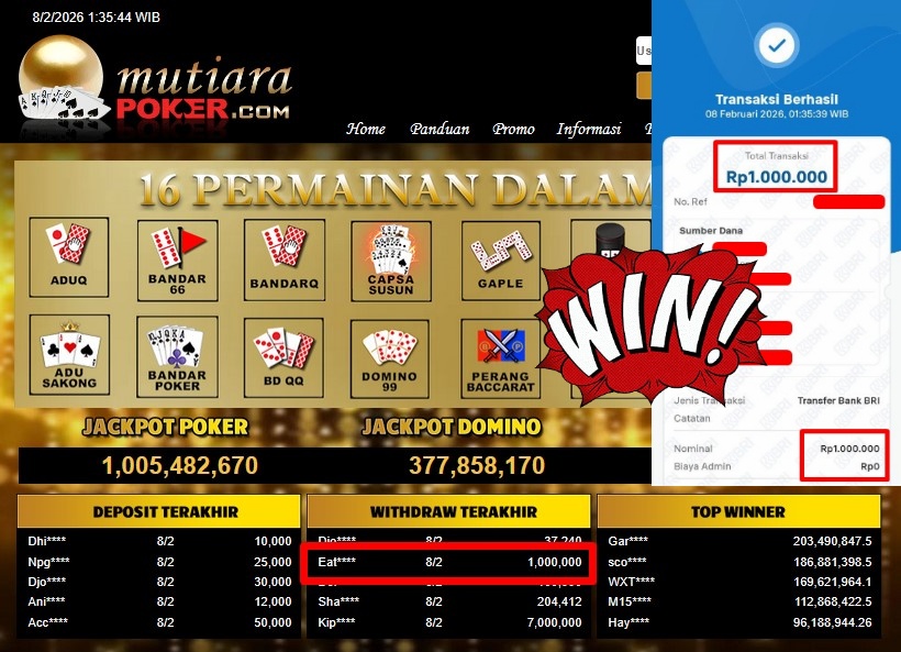 Bukti Withdraw ( 1.000.000,- ) Member Setia MutiaraPoker