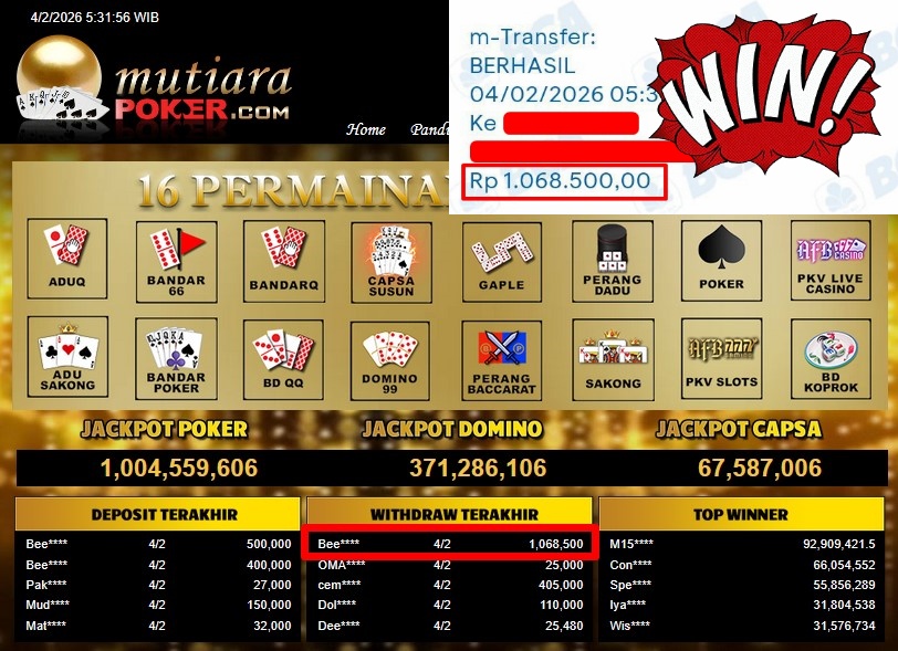 Bukti Withdraw ( 1.068.500,- ) Member Setia MutiaraPoker