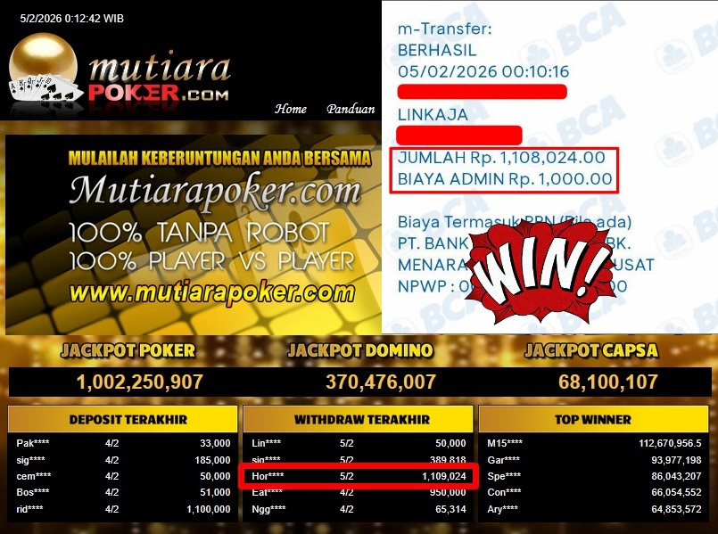 Bukti Withdraw ( 1.109.024,- ) Member Setia MutiaraPoker