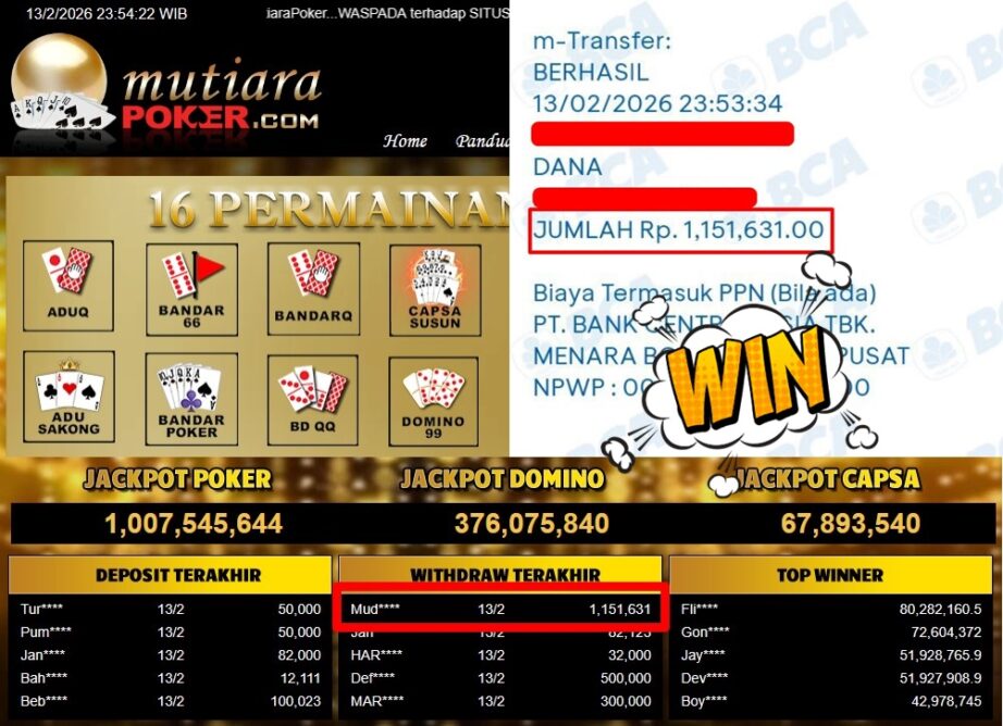 Bukti Withdraw ( 1.151.631,-) Member Setia Mutiarapoker