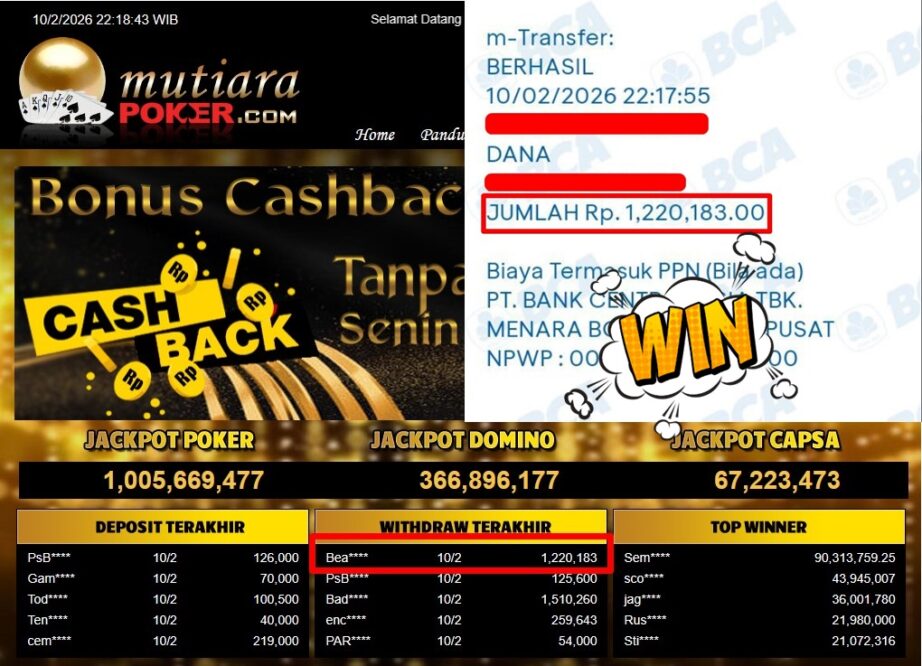 Bukti Withdraw ( 1.220.183,-) Member Setia Mutiarapoker