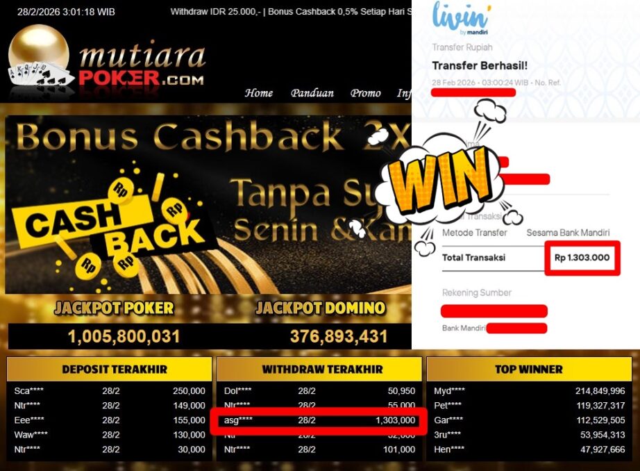Bukti Withdraw ( 1.303.000,-) Member Setia Mutiarapoker