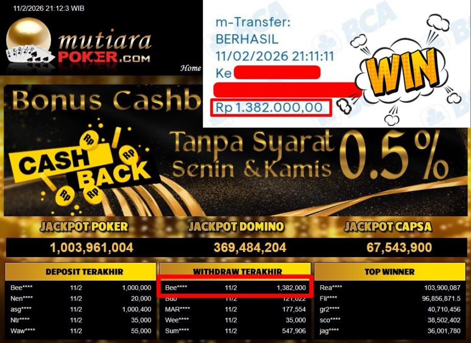 Bukti Withdraw ( 1.382.000,- ) Member Setia MutiaraPoker