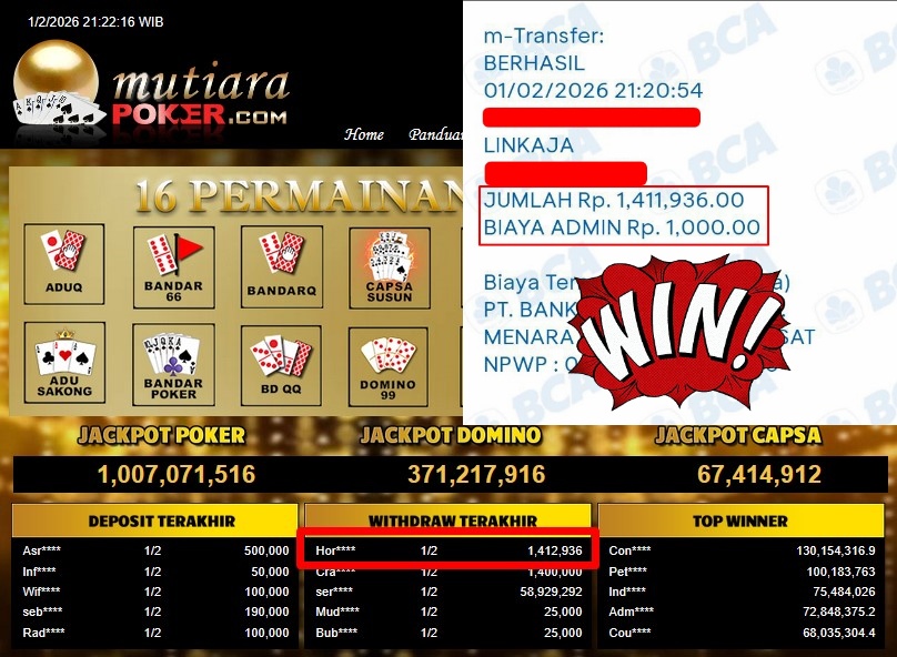 Bukti Withdraw ( 1.412.936,- ) Member Setia MutiaraPoker