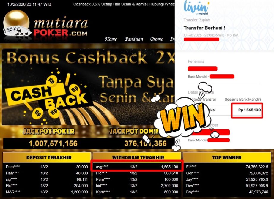Bukti Withdraw ( 1.565.100-) Member Setia Mutiarapoker