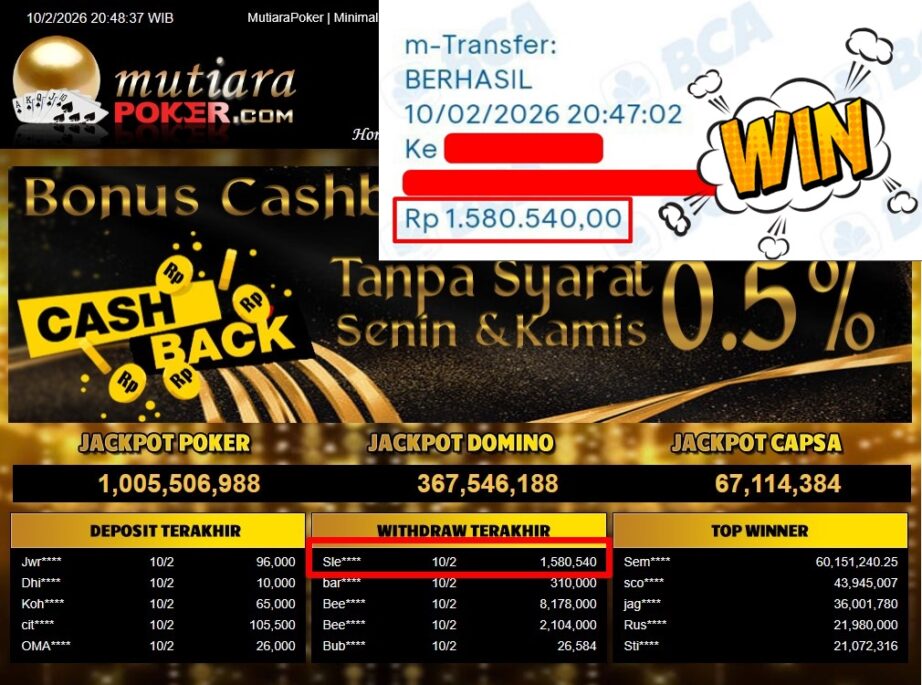 Bukti Withdraw ( 1.580.540,-) Member Setia Mutiarapoker