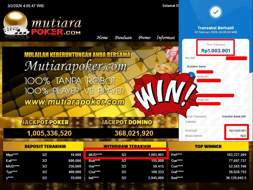 Bukti Withdraw ( 1,003,901,- ) Member Setia MutiaraPoker