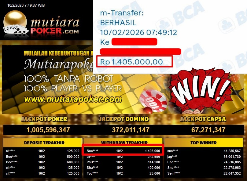 Bukti Withdraw ( 1,405,000,- ) Member Setia MutiaraPoker