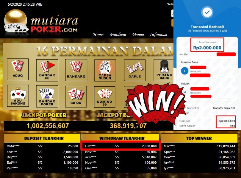 Bukti Withdraw ( 2.000.000,- ) Member Setia MutiaraPoker