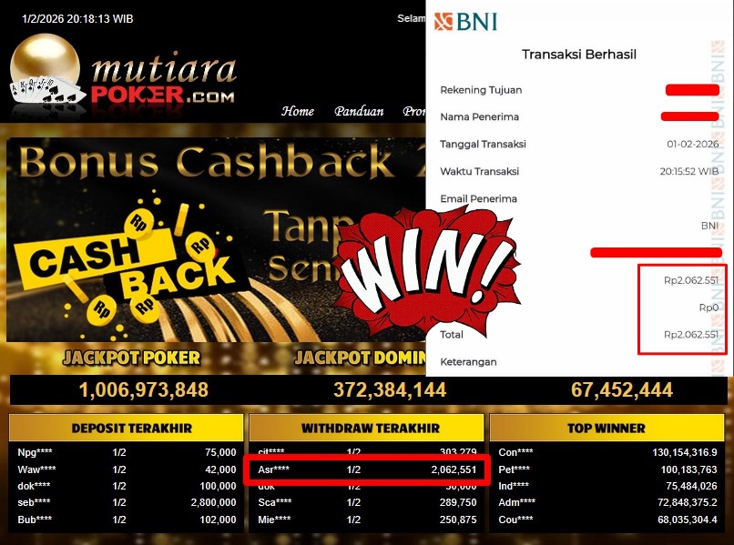 Bukti Withdraw ( 2.062.551,- ) Member Setia MutiaraPoker