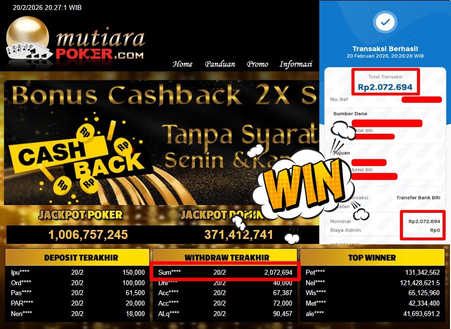 Bukti Withdraw ( 2.072.694,-) Member Setia Mutiarapoker