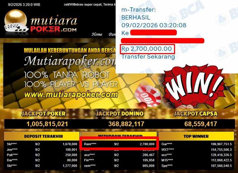 Bukti Withdraw ( 2.700.000,- ) Member Setia MutiaraPoker