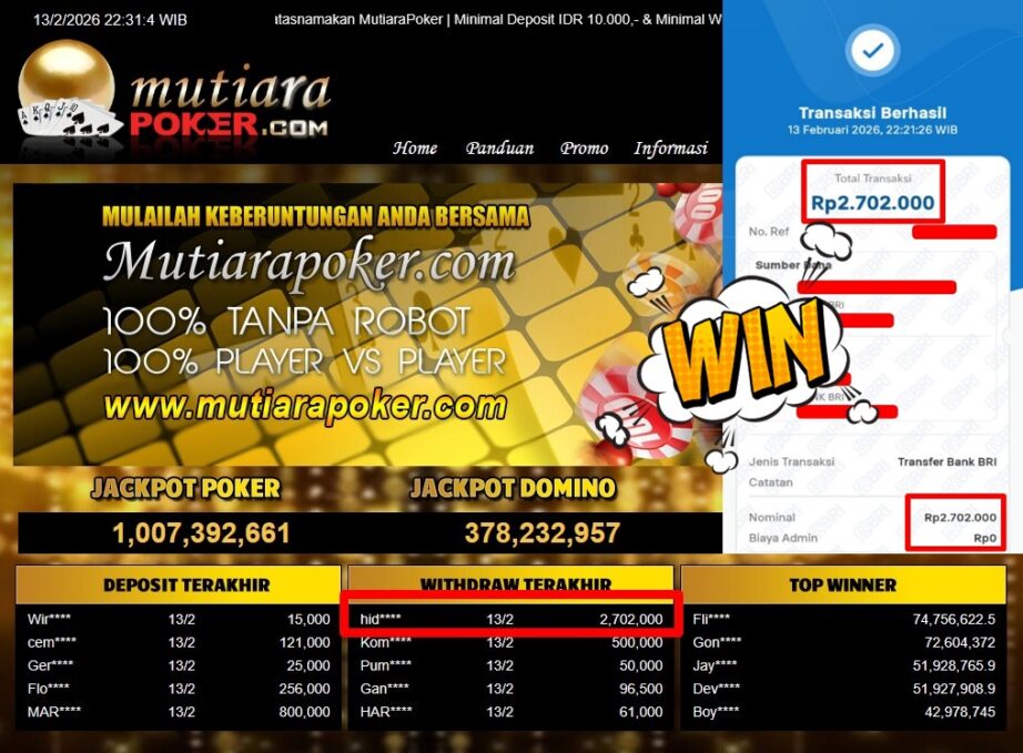 Bukti Withdraw ( 2.702.000,-) Member Setia Mutiarapoker