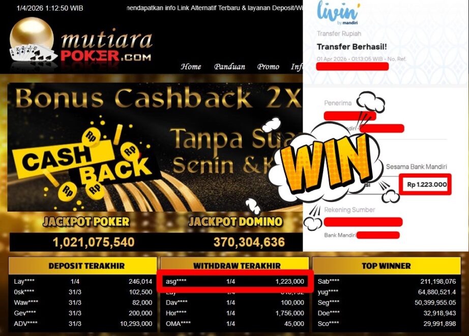 Bukti Withdraw ( 1.223.000,-) Member Setia Mutiarapoker