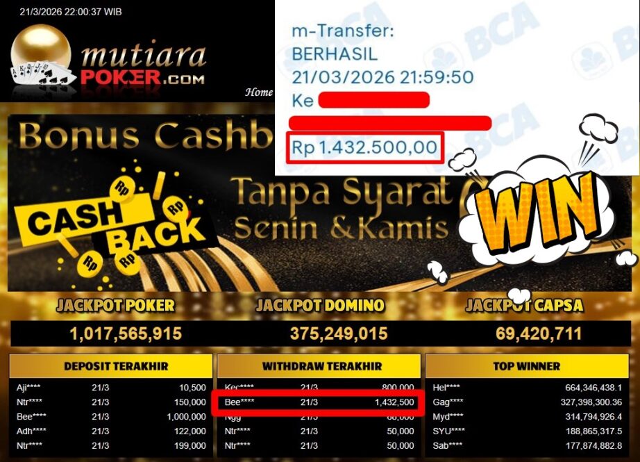 Bukti Withdraw ( 1.432.500,-) Member Setia Mutiarapoker
