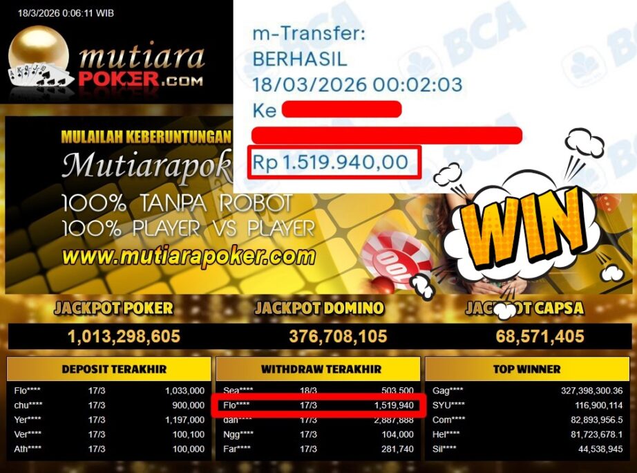 Bukti Withdraw MutiaraPoker
