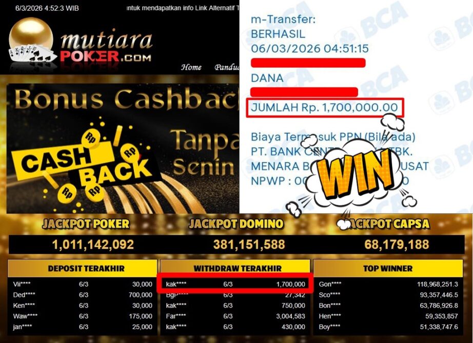 Bukti Withdraw MutiaraPoker