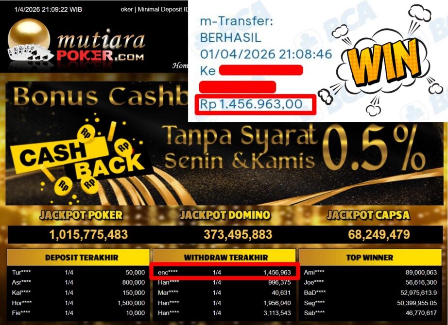 Bukti Withdraw ( 1.456.963,-) Member Setia Mutiarapoker