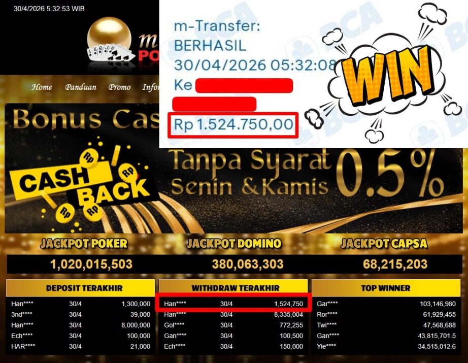 Bukti Withdraw ( 1.524.750,-) Member Setia Mutiarapoker